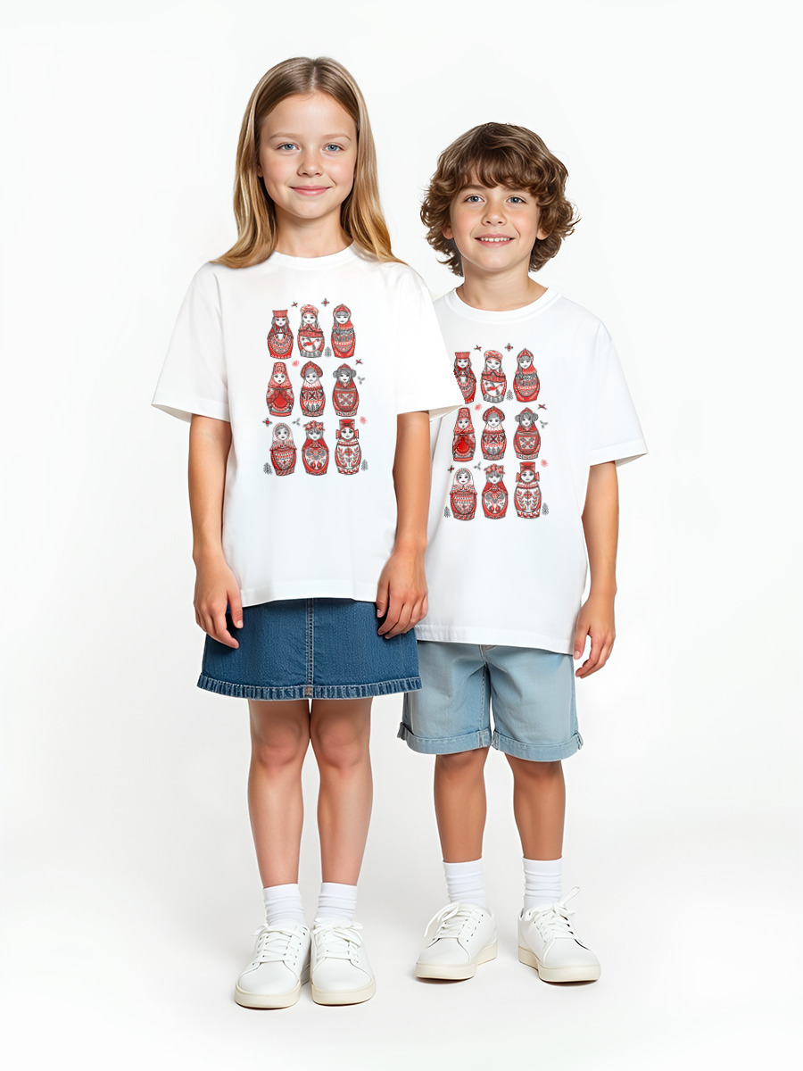 Детская оверсайз футболка «Девять матрёшек. Мезенские мотивы.» цвет белый