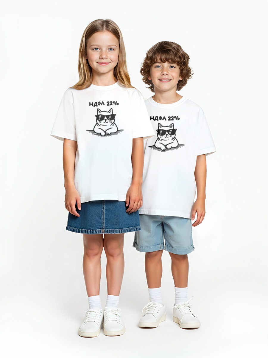 Детская оверсайз футболка «Коротко о себе НДФЛ 22 процента мемный кот 22» цвет белый