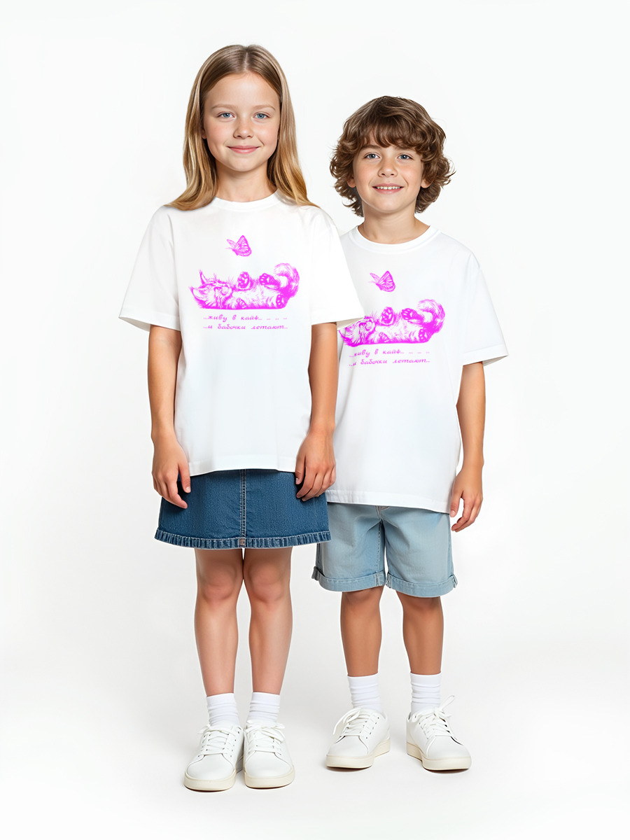 Детская оверсайз футболка «Котик милый бабочка розовый» цвет белый