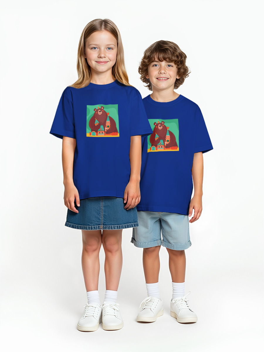 Детская оверсайз футболка «Русский медведь обнимает башни Кремля» цвет синий