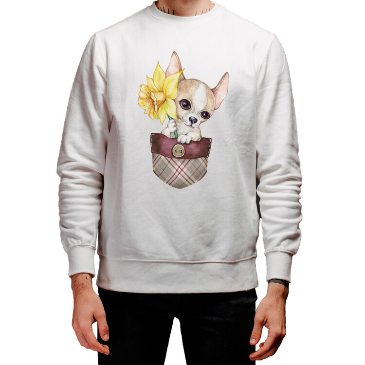 Мужской свитшот «Собачка в кармане. Чихуа и нарцисс» цвет белый