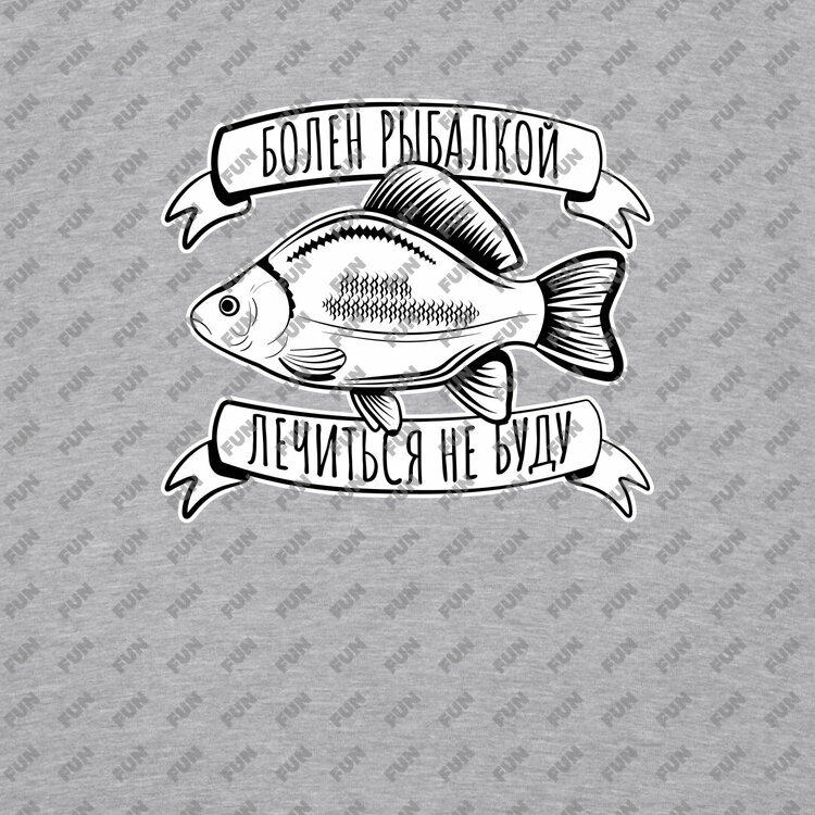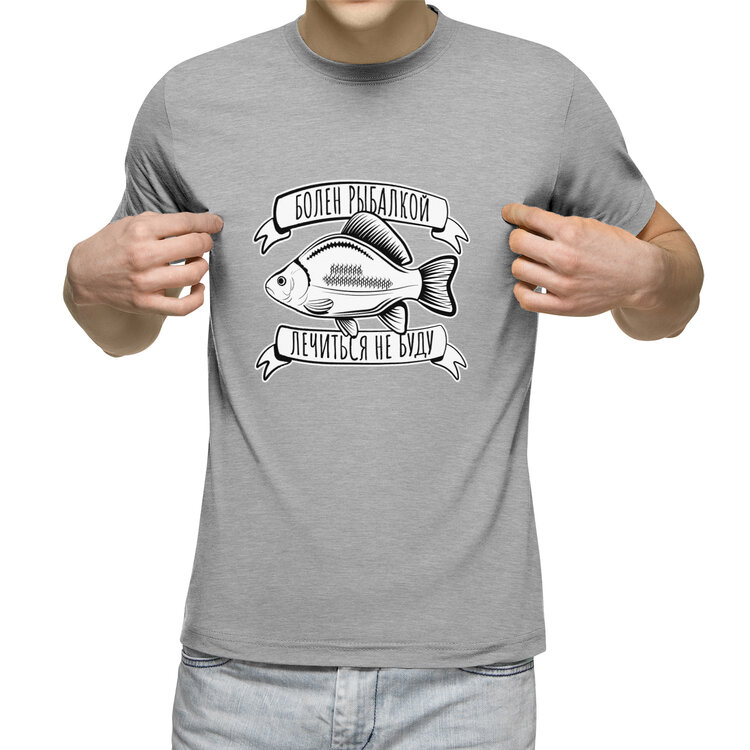 Мужская футболка «Карась и надпись про рыбалку с ленточками» цвет серый меланж
