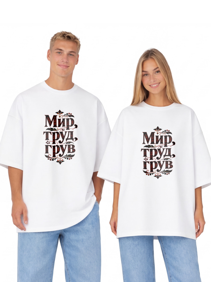 Футболка оверсайз «Мир, труд, грув, русский стиль»