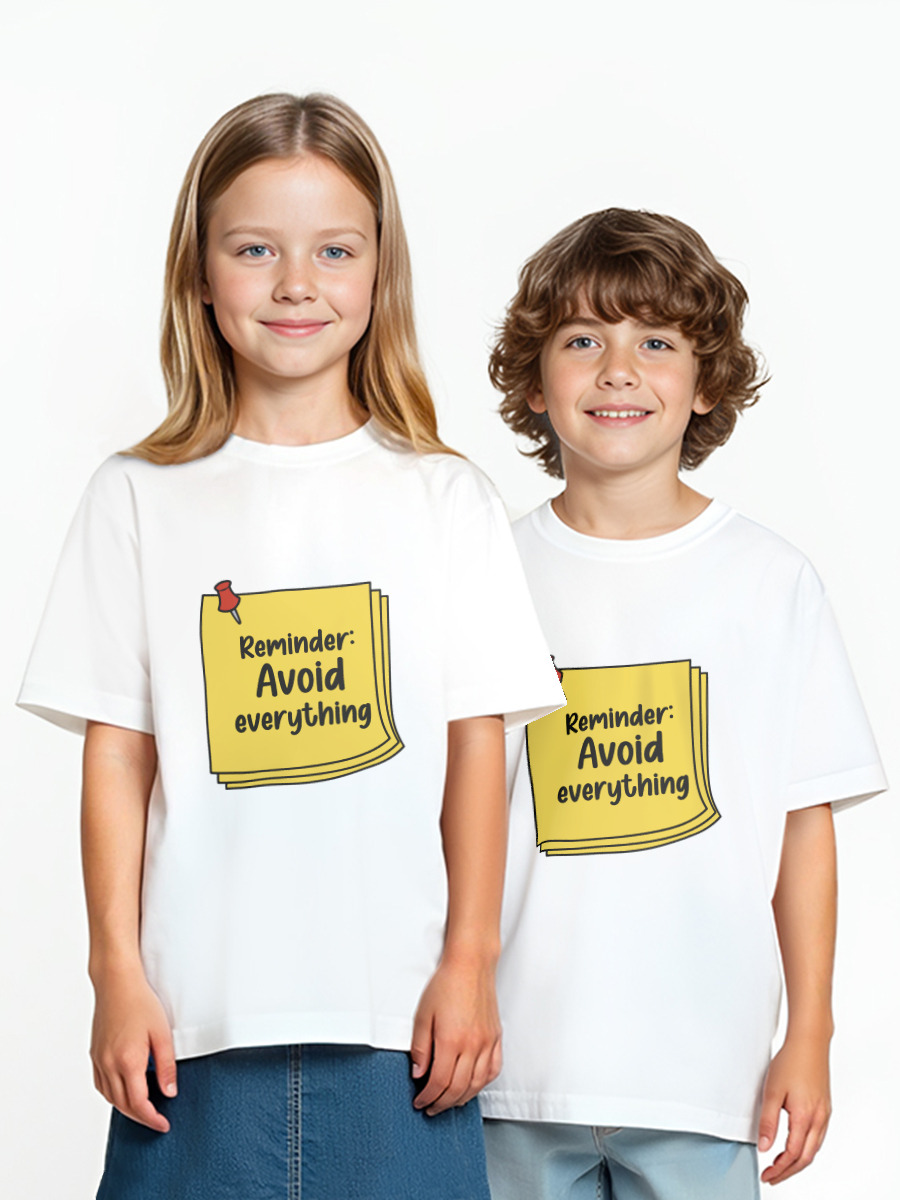 Детская футболка «Стикер-напоминание: Avoid everything с кнопкой»