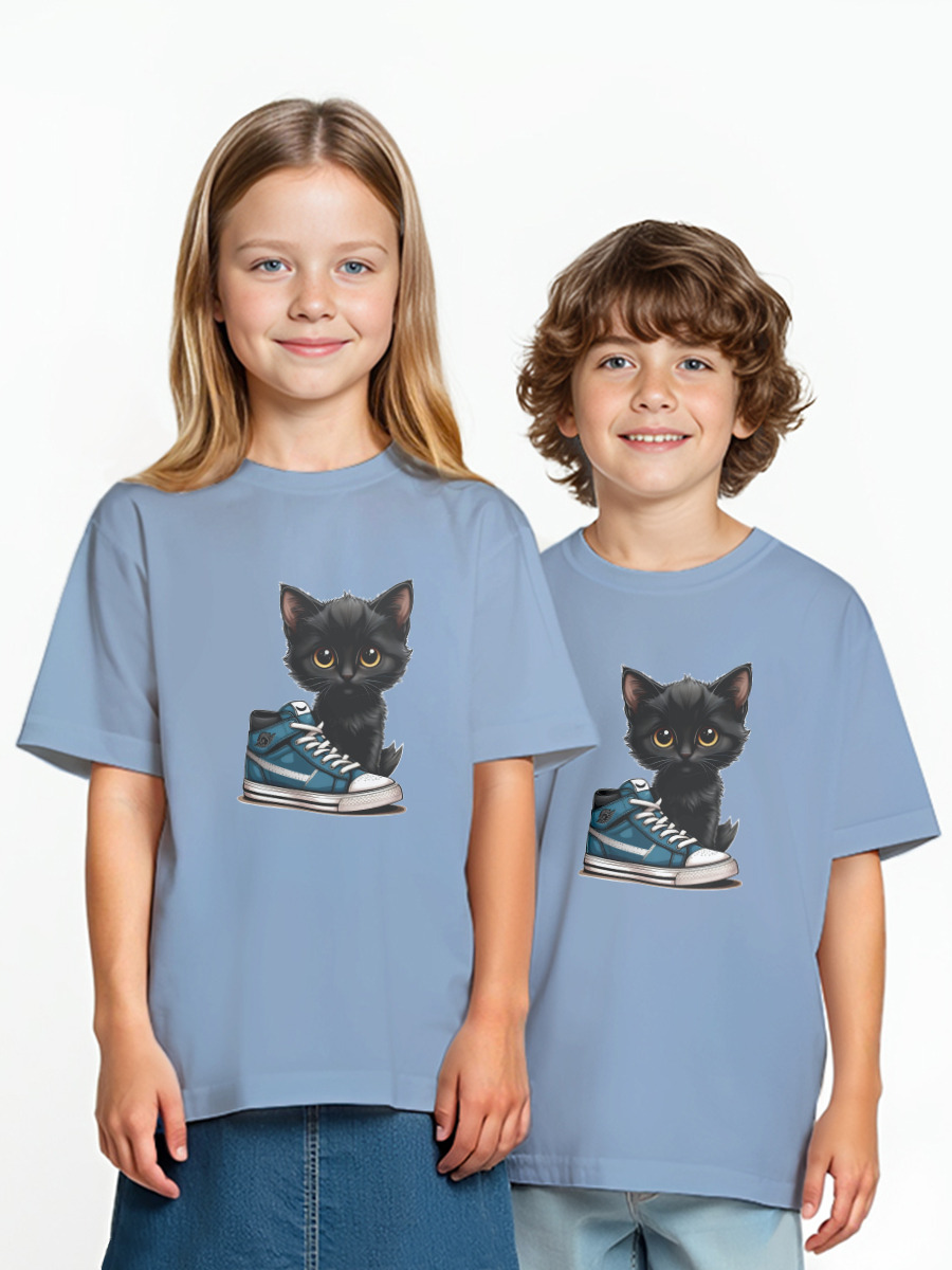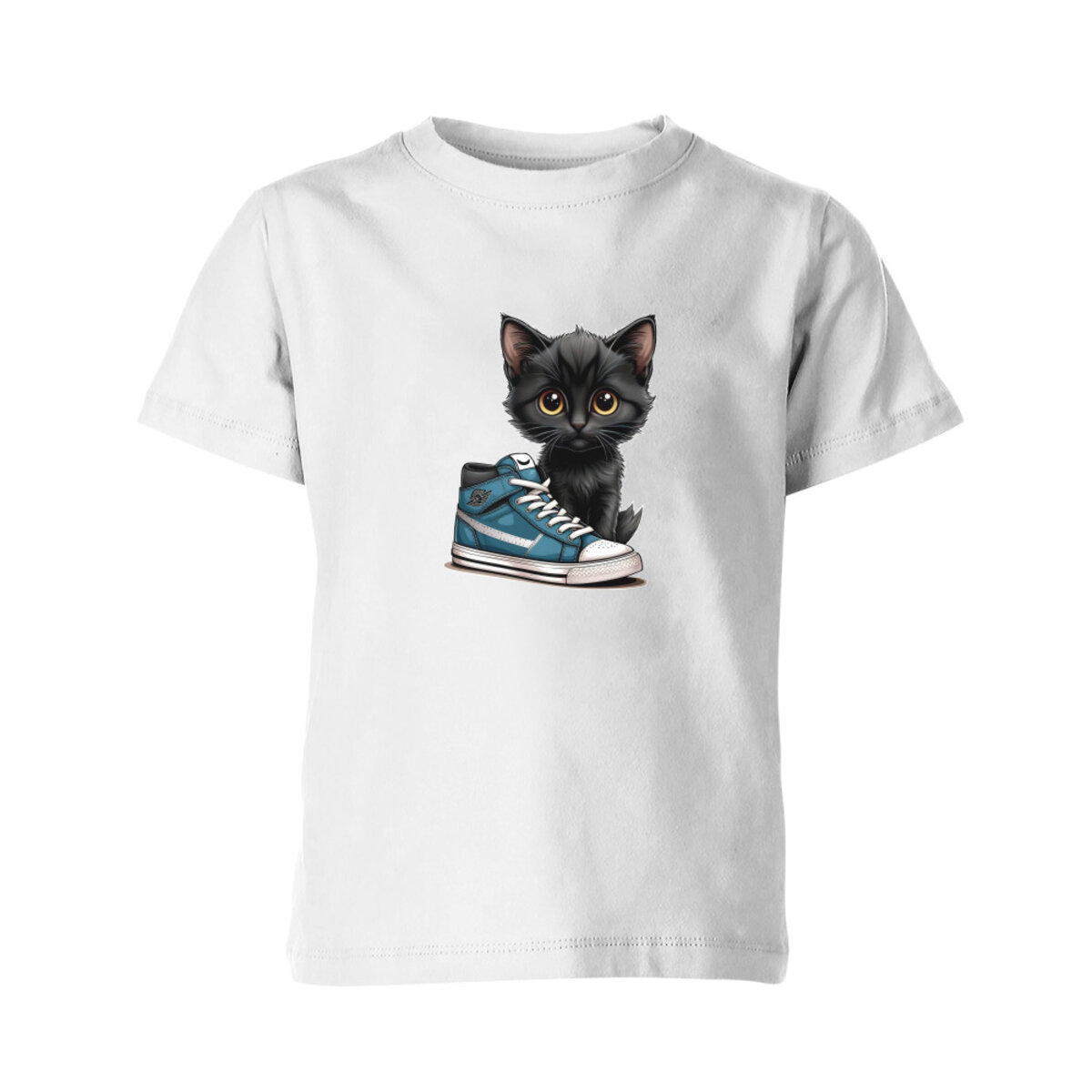 Детская оверсайз футболка «Чёрный котёнок с кроссовком»