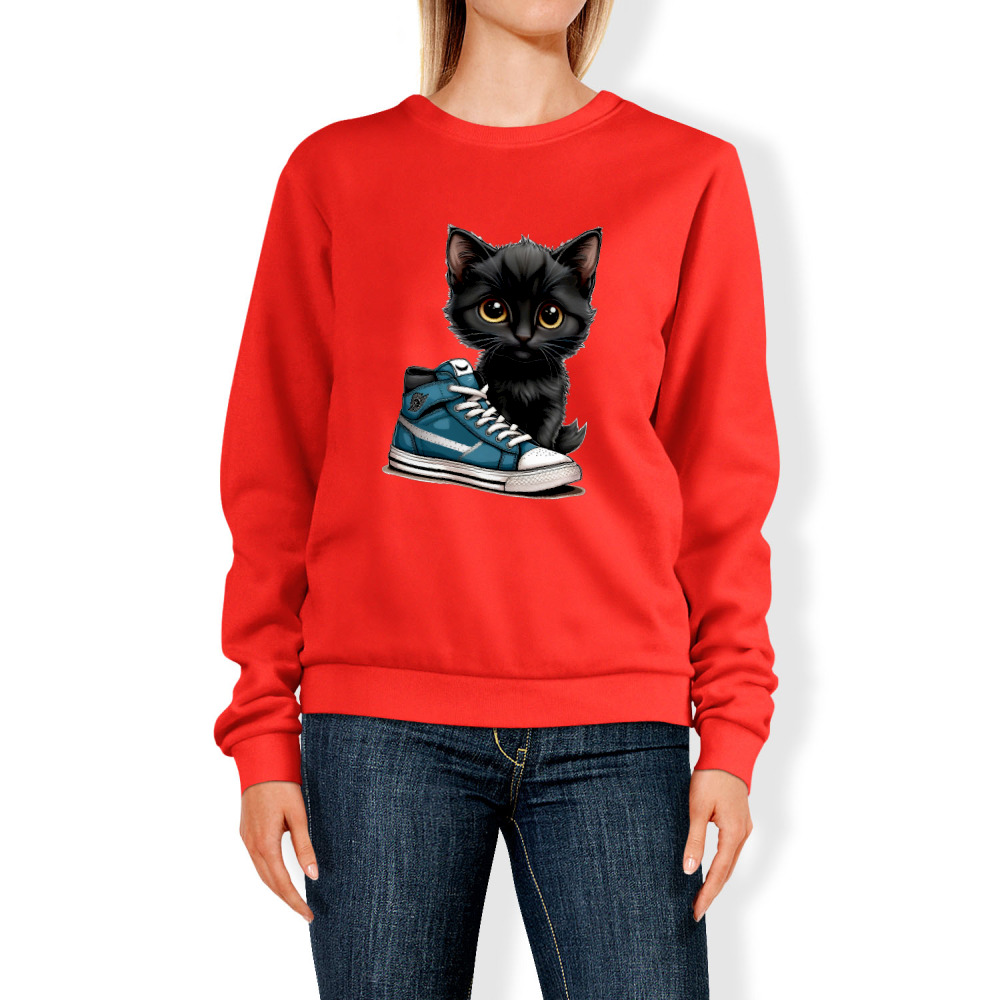 Женский свитшот «Чёрный котёнок с кроссовком»