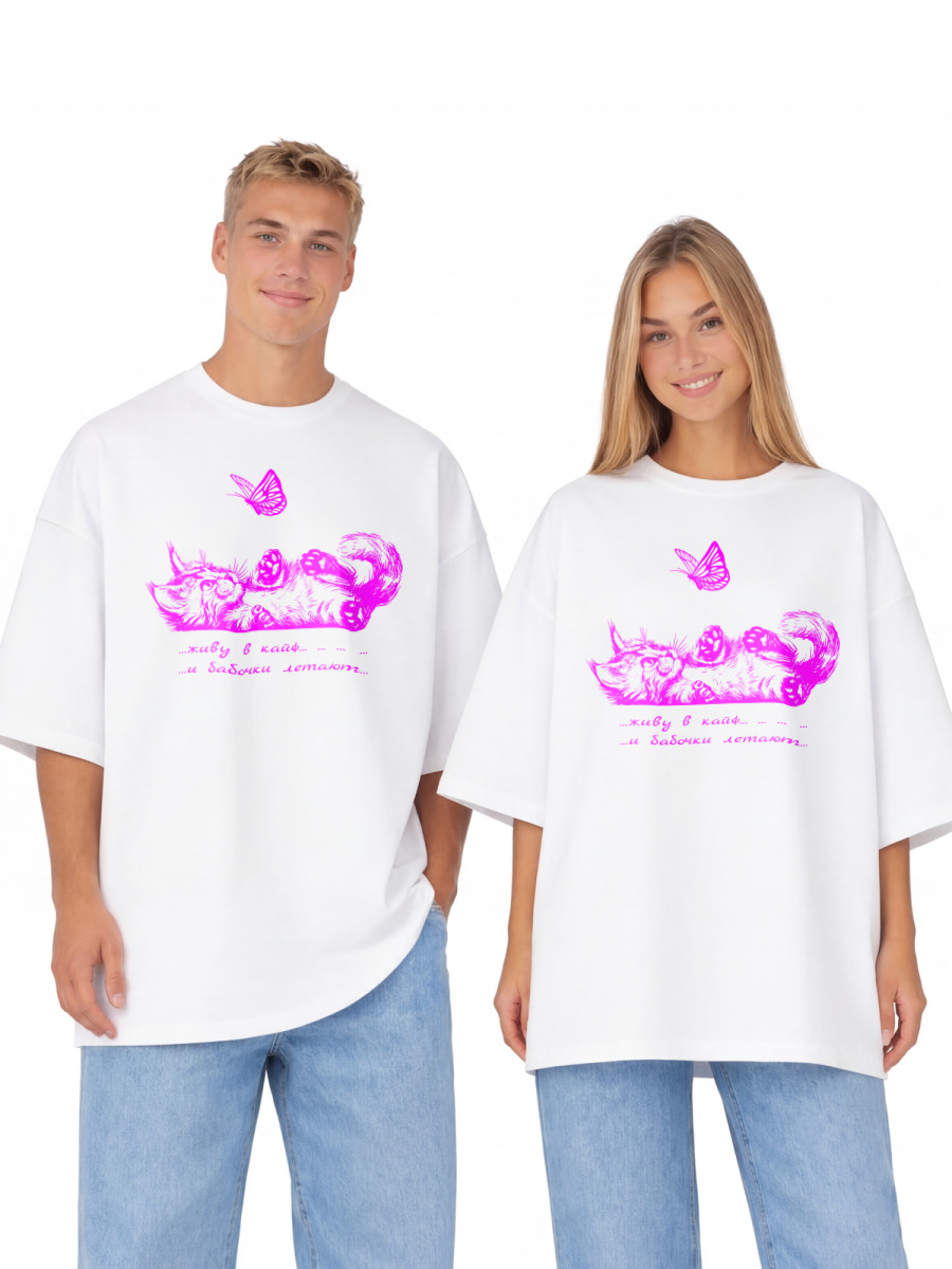 Футболка оверсайз «Котик милый бабочка розовый» цвет белый