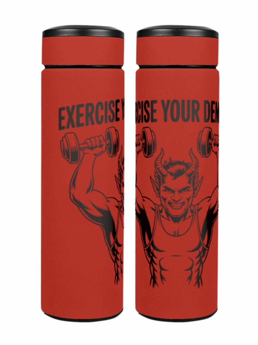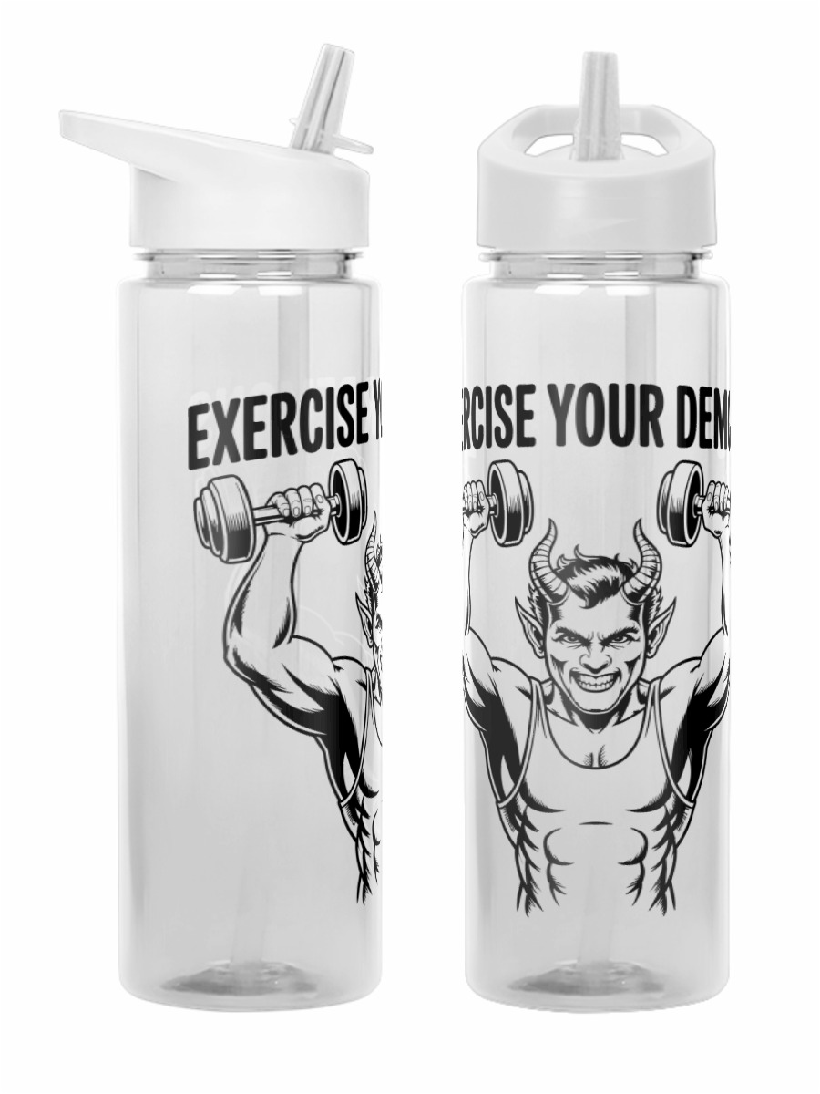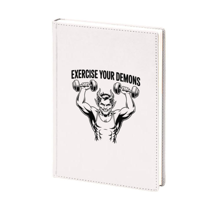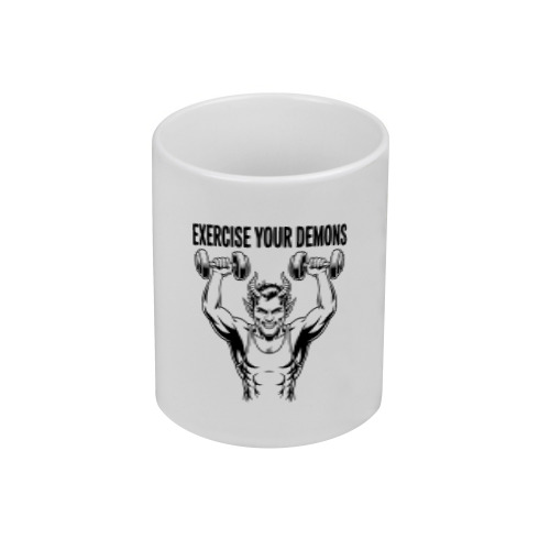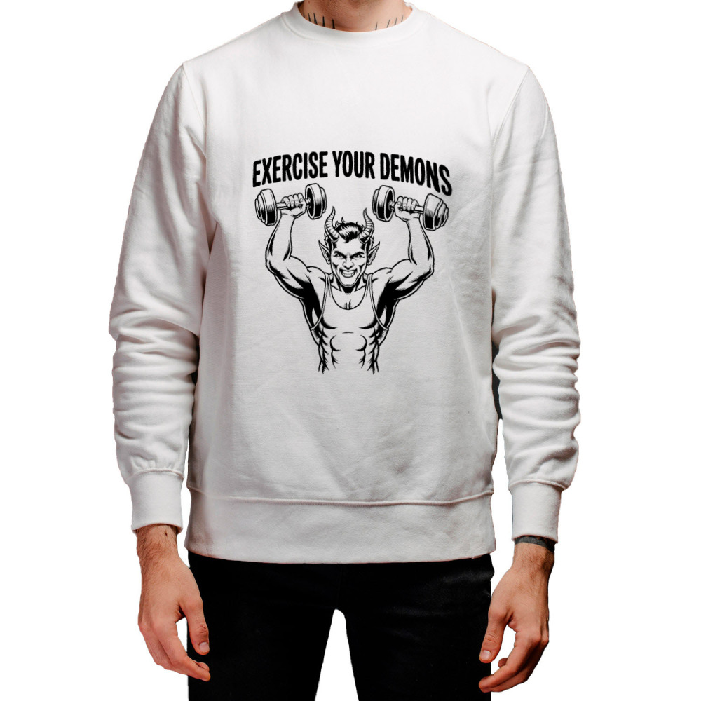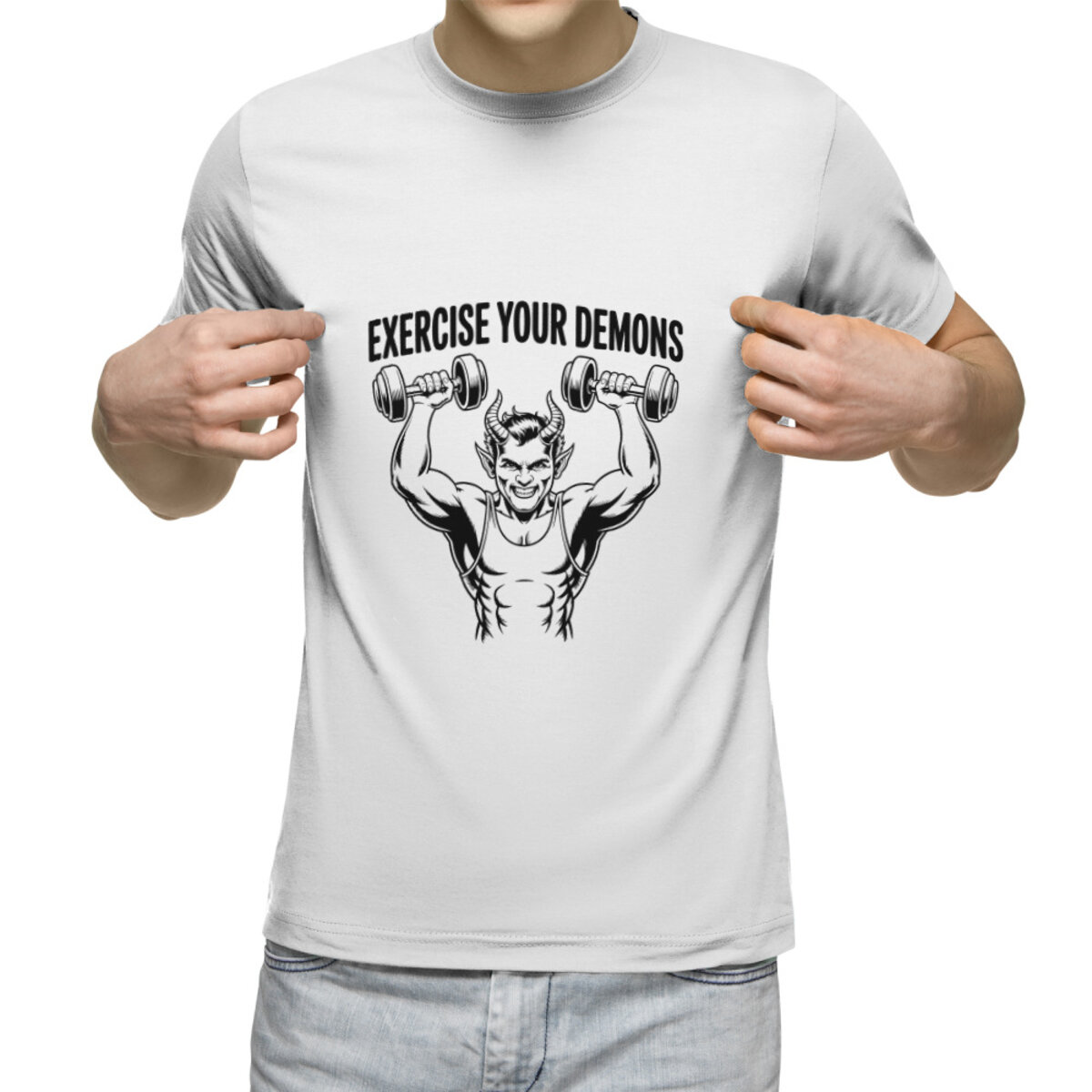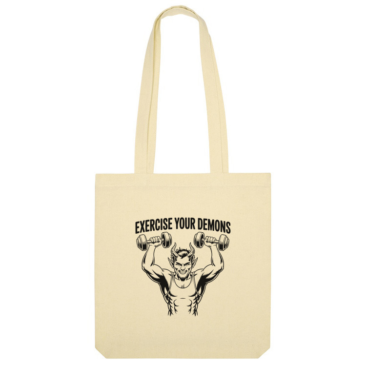 Женская футболка «Демон с гантелями надпись Exercise your demons» цвет белый