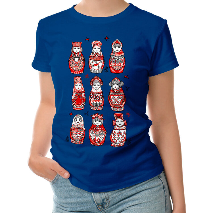 Женская футболка «Девять матрёшек. Мезенские мотивы.» цвет темно-синий