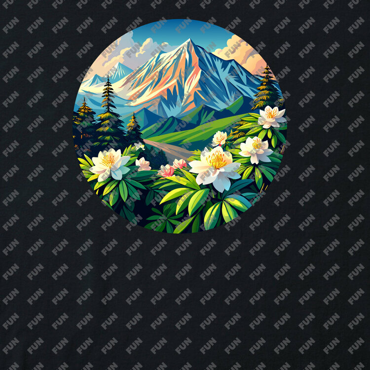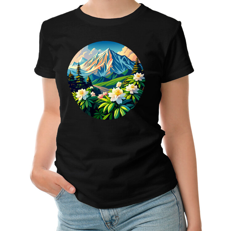 Женская футболка «Горы и цветы» цвет черный