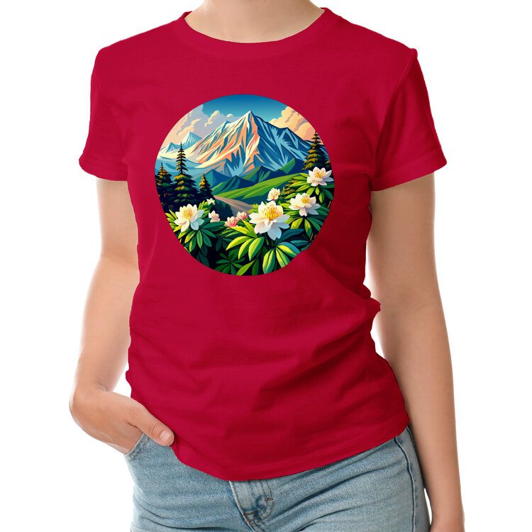 Женская футболка «Горы и цветы» цвет красный