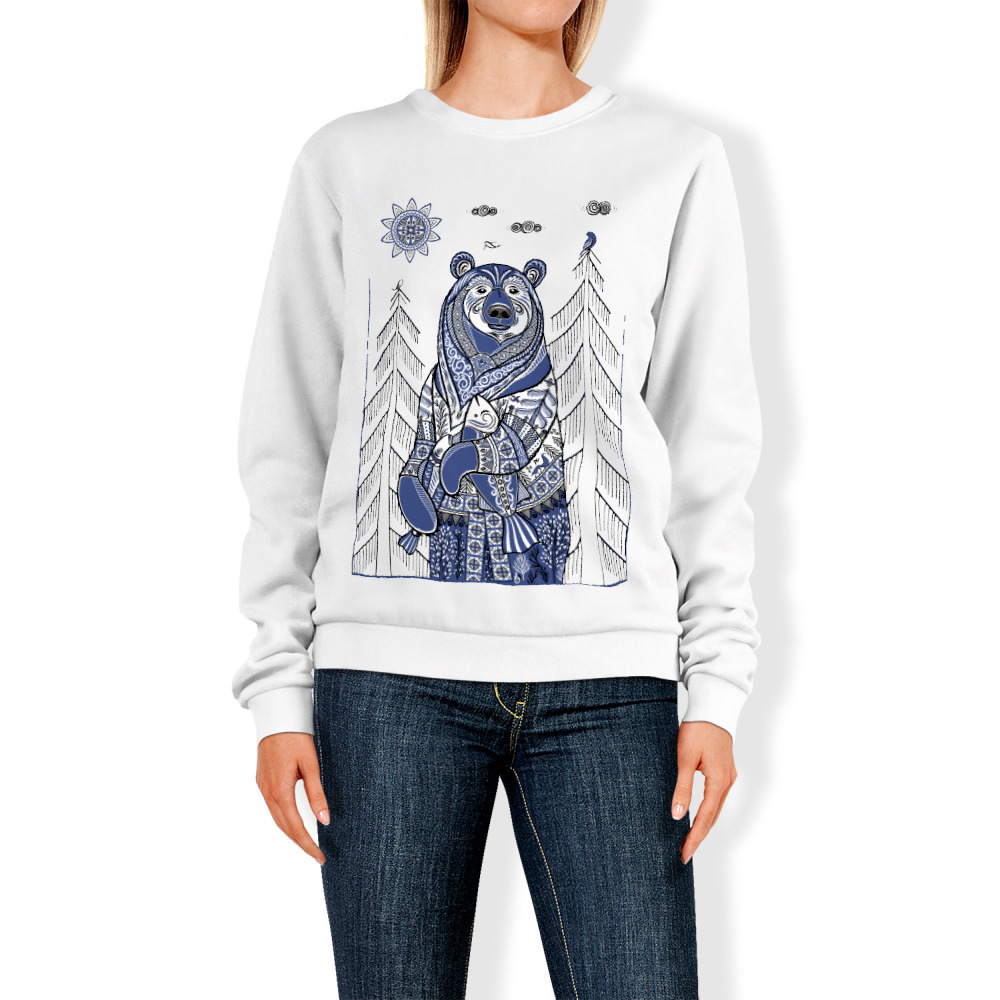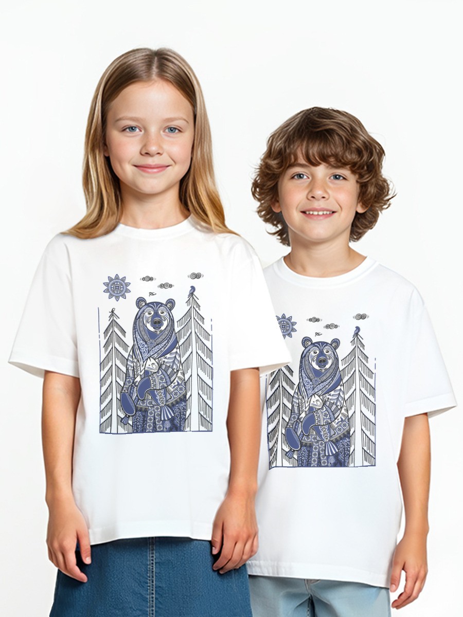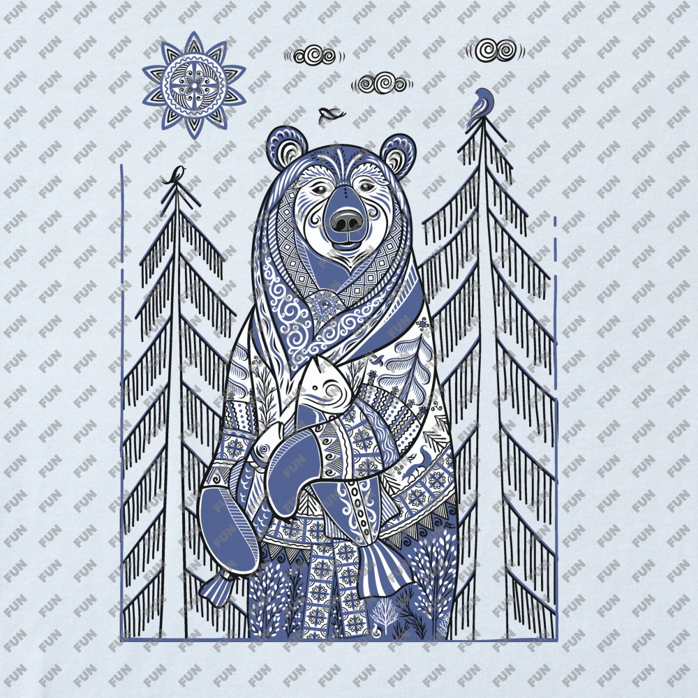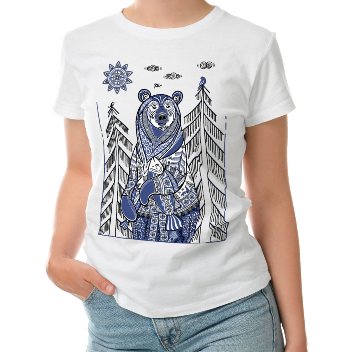Женская футболка «Медведь с рыбой в стиле мезенской росписи» цвет белый