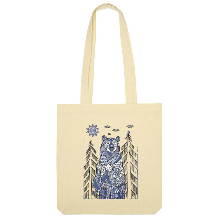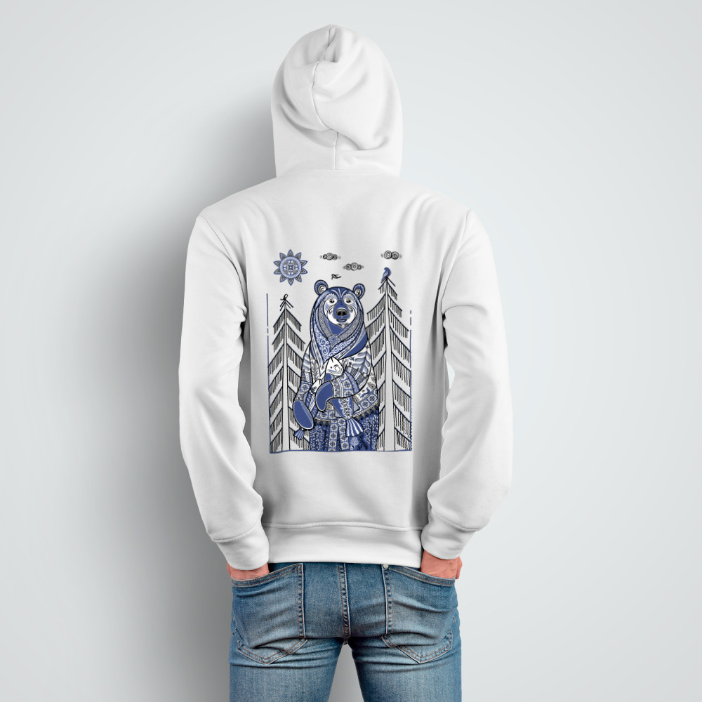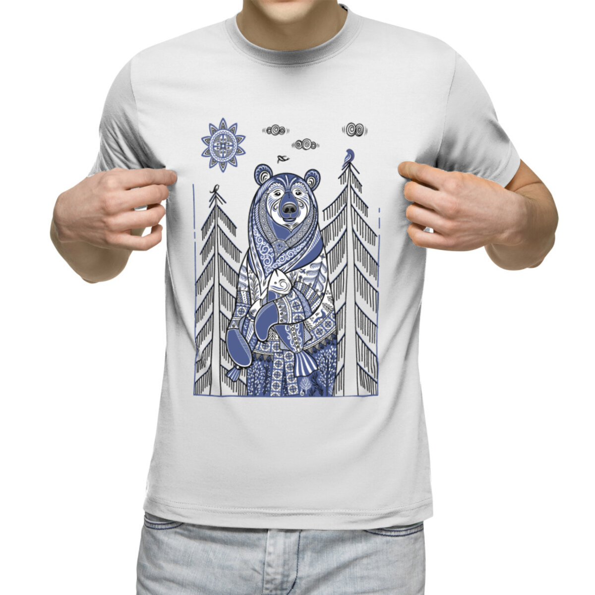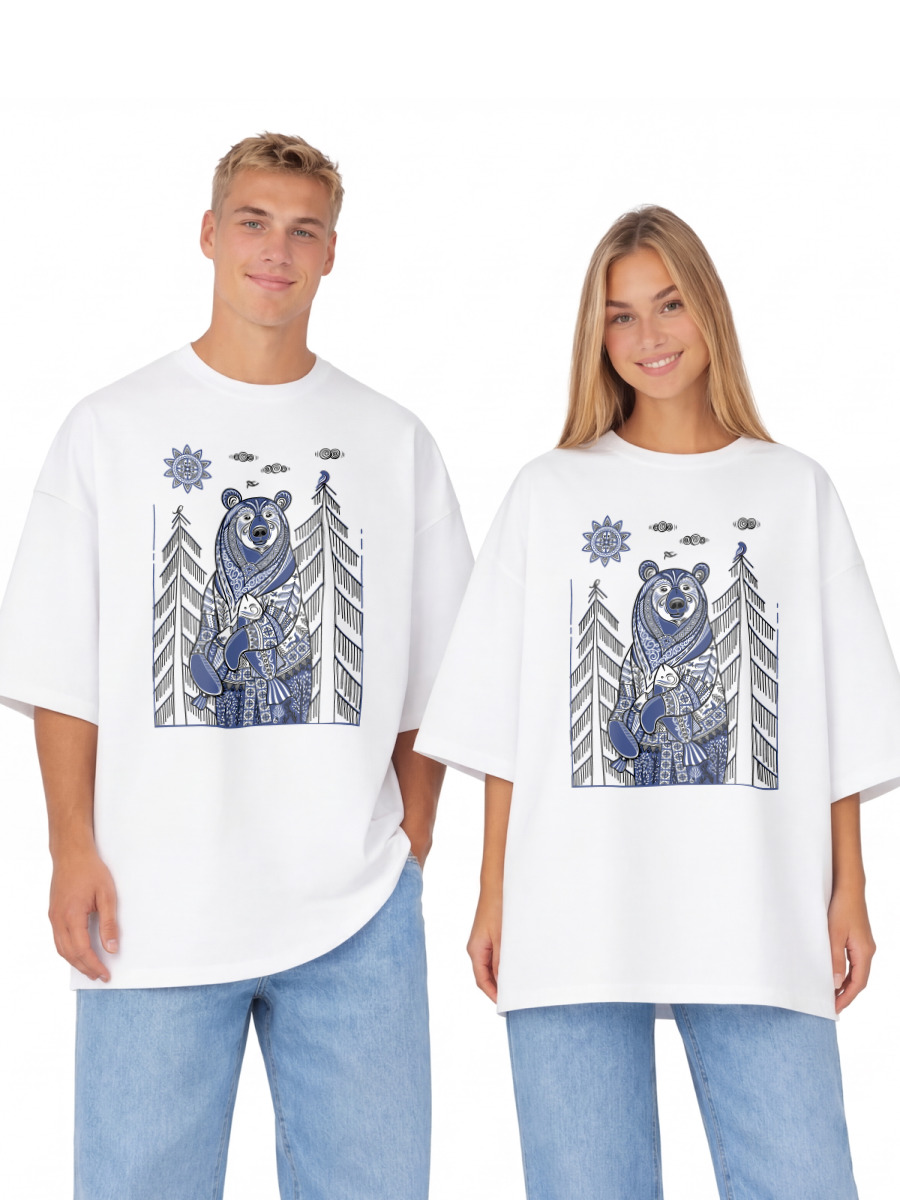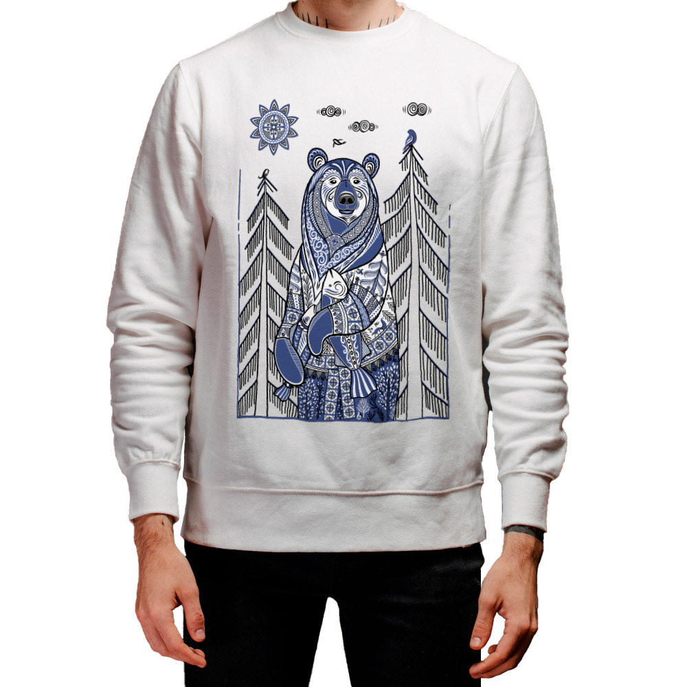 Женская футболка «Медведь с рыбой в стиле мезенской росписи» цвет белый