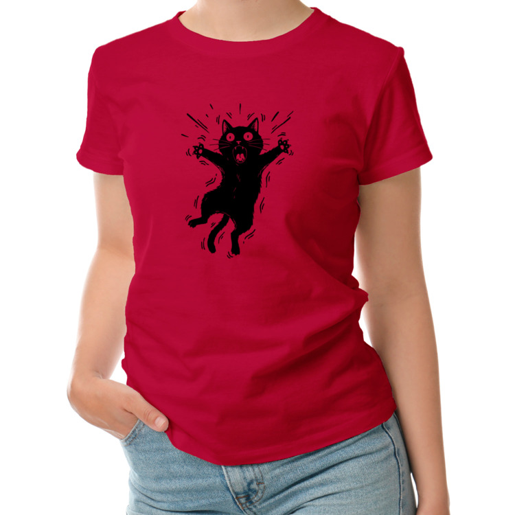 Женская футболка «Орущий испуганный черный кот» цвет красный