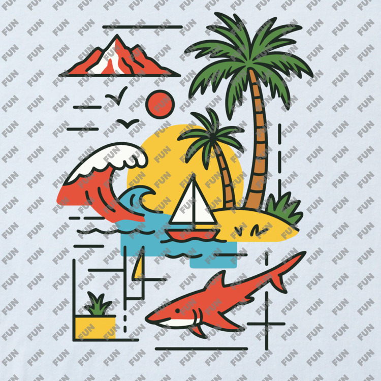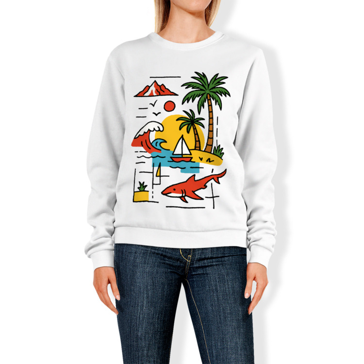 Женская футболка «Тропический пейзаж: корабль, акула и горы» цвет белый